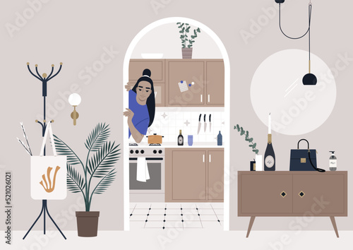 Parents creating child world, vector flat illustration. Happy girl painting world picture sitting on fathers shoulders. Mom and dad modeling behaviour and forming the mind of child like doing puzzle.
