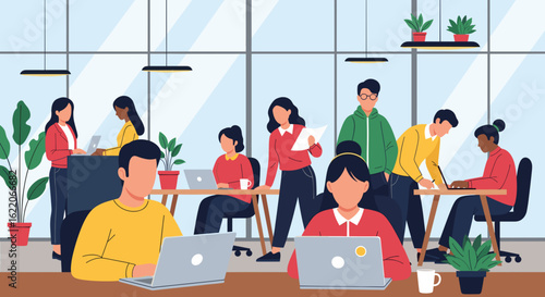 Passengers traveling by city metro train, flat vector illustration. Female and male characters standing, sitting, reading. People commuting to and from work. Modern city public transport.