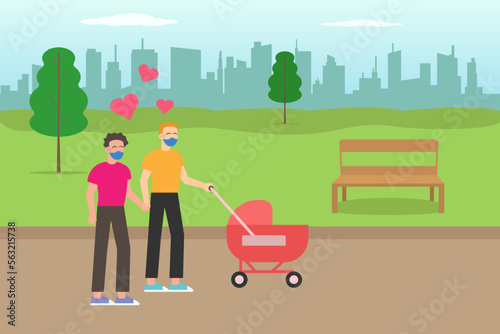Passive smoke concept vector illustration. Man smokes next to pregnant woman at the bus stop. No smoking area, public place, bar. Tobacco and smoking cigarette addiction. Second hand smoke.