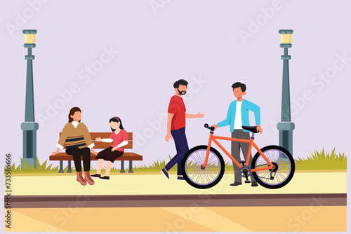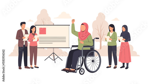 Woman with leg prosthesis sitting in wheelchair, flat vector illustration. Patient with disability visiting doctor to put on prosthetic limb. Disabled healthcare. Physical therapy. Orthopedic center.
