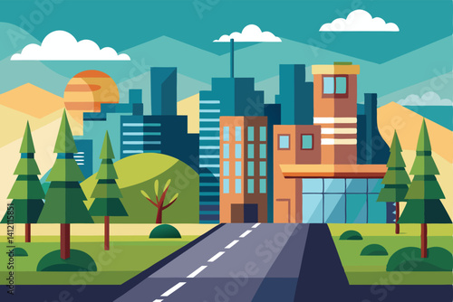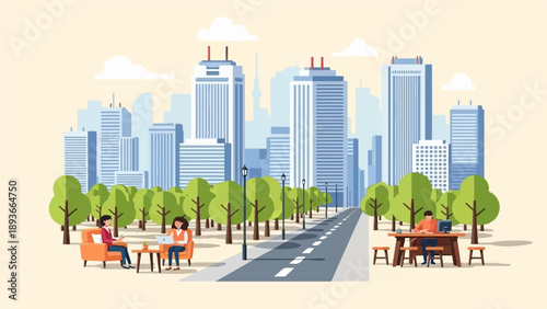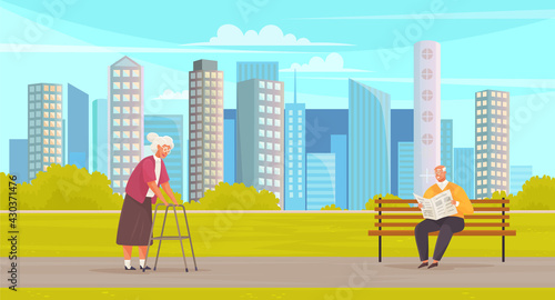 City scene set. People walk along the street, cross the road at pedestrian crossing on green light, roller skate, ride electric scooter, flat vector illustration. Pedestrian traffic.