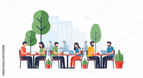 Vector illustration of happy couples dating, having dinner at restaurant. Pairs of lovers watching sunset. People and relations concept flat style design elements.