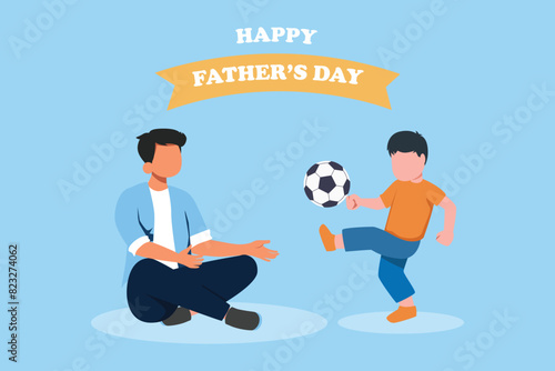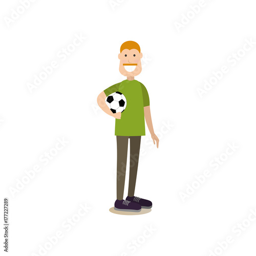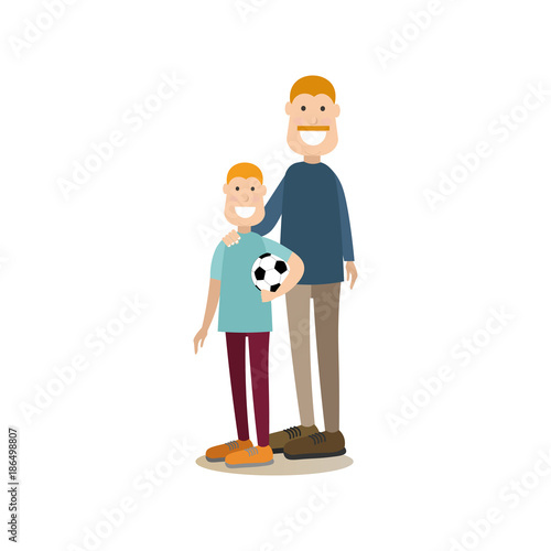 Vector illustration of father with his son holding ball. Childcare and parenting, people and relations concept flat style design element, icon isolated on white background.