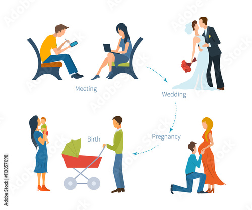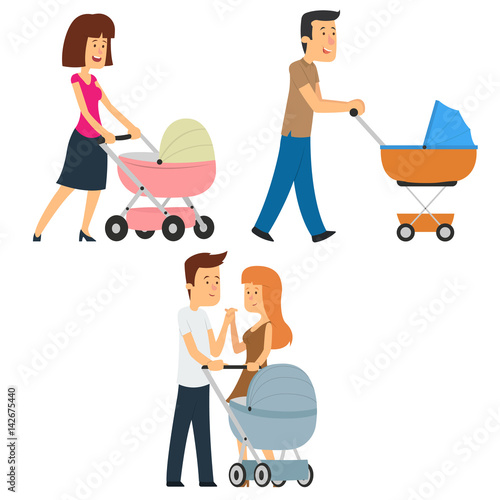 Family couple with newborn baby in pram walking together. People and relations concept flat style design element, icon isolated on white background.