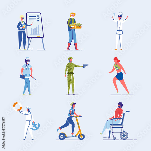 Group of people enjoying their hobbies vector flat illustration. Embroidery, cooking, photography, sport, model ships and airplanes, astronomy, flower gardening, karaoke.