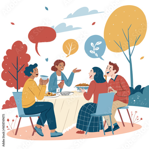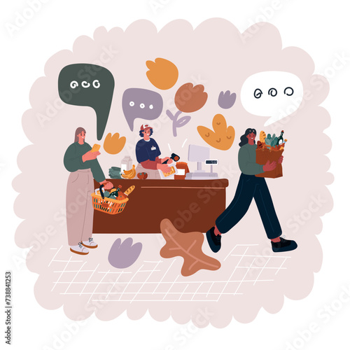People buying and eating meals in canteen dining room, vector flat illustration. Male and female characters having lunch, snack in cafe, food court, cafeteria, student or company staff canteen.