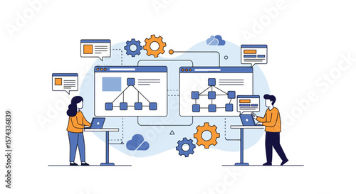 People catching bugs on laptop computer screen, flat vector isometric illustration. Software testing, quality assurance, debugging.