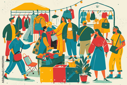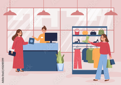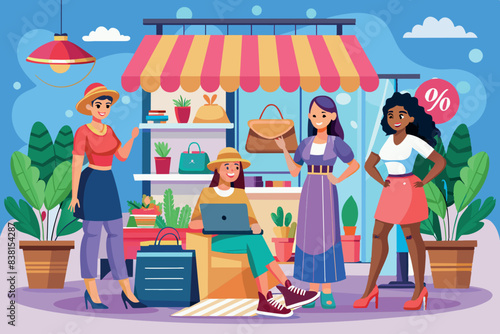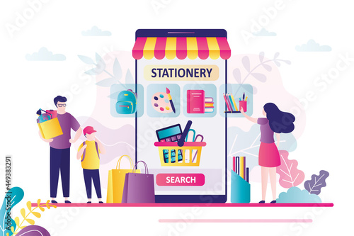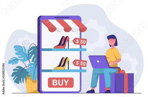 People choosing shoes in online shop, flat vector illustration. Internet store, mobile shopping, ecommerce.