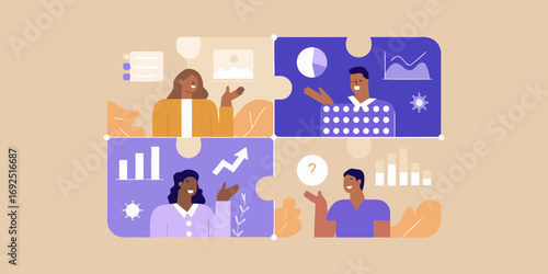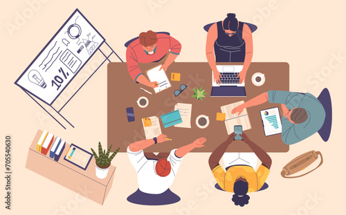 Group of business people discussing project startup, company strategy, vector flat top view illustration. Boardroom meeting, conference, brainstorm, teamwork, handshake.