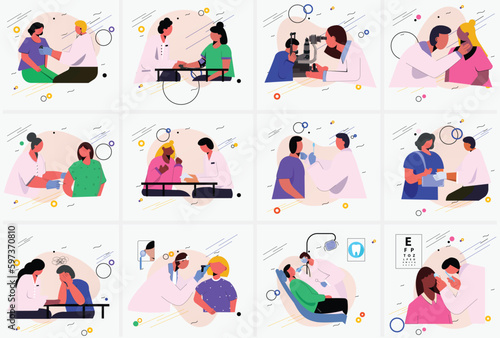 People doing housework and cleaning home. Vector set of posters with man vacuuming floor and woman wash dishes and clean window. Home interior, vacuum robot, people busy with cleaning household.