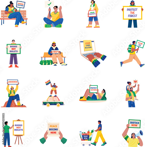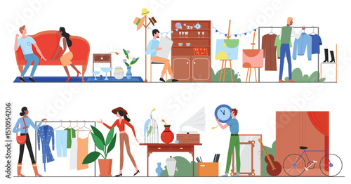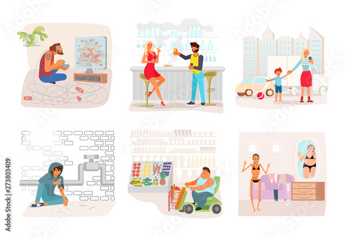 People dreaming scene set, flat vector illustration isolated on white background. Dreamy male, female cartoon characters relaxing at home and thinking sitting in armchair, by the window, reading book.