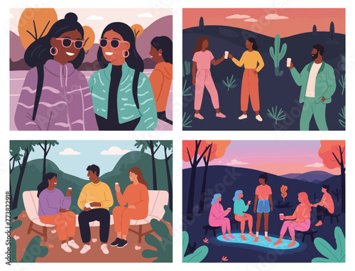 People drinking wine, whisky, beer and tequila vector set. Different national beverage for lunch or dinner, friends online meeting on weekend illustration. Traditional drinks concept