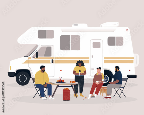 People enjoy auto camping flat vector illustration. Friends having outdoor barbeque picnic during car trip adventure