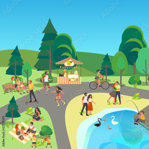 Hot springs pool. People enjoying thermal spa water in winter, flat vector illustration. Mountain onsen, japanese natural hot springs resort. Relax, recreation.