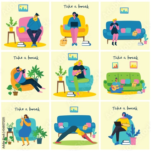 People enjoying their hobbies vector flat illustration. Amateur theater, playing saxophone, painting from model, sewing or custom tailoring. Music, arts and craft hobbies.