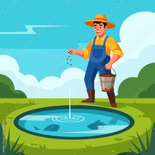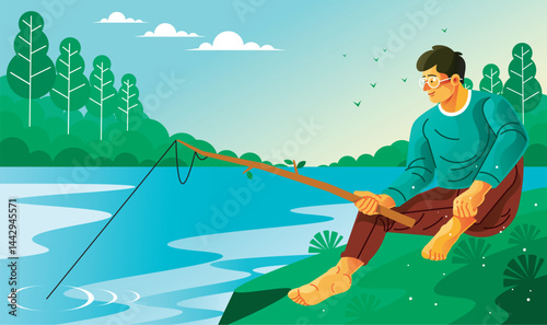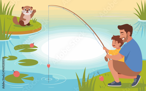 People fishing in pond, lake or river set. Young or adult single man, father and son catching fish with spinning rod vector illustration. Masculine hobby and recreation time