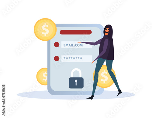 People giving money to thief, cyber criminal from mobile phone attracting cash with magnet, flat vector isometric illustration. Credit card fraud, cyber crime, financial fraud.