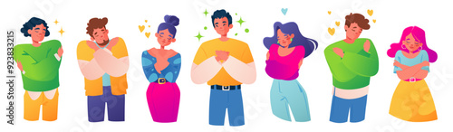 People holding, giving hearts sharing love to others, flat vector isolated illustration. Romantic feelings, love relationship.