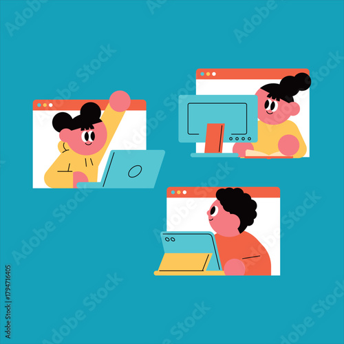 Dialog speech bubbles with people using laptop computers, reading books inside, flat vector illustration. Business dialog, communication, online chat, conversation.