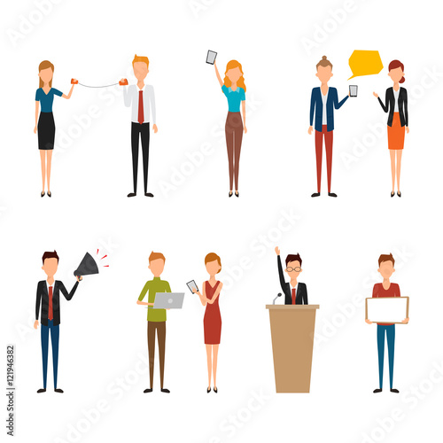 Election campaign and voting concept vector flat illustration isolated on white background. People involved in election process. Political candidates making statements, voters in polling station.