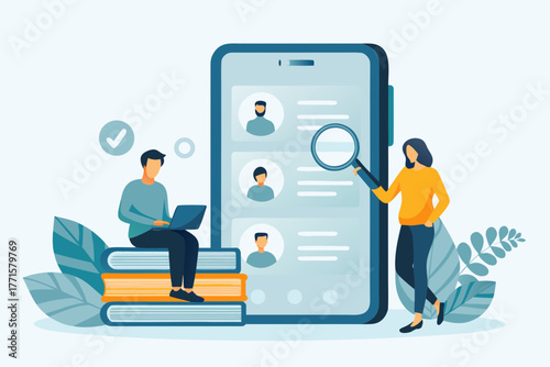 People listening to music, radio program or podcasts online, flat vector illustration. Podcasting.