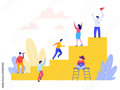 People looking to the future through telescope, binoculars while floating on boat, standing on mountain top, ladder, flat vector illustration. Future vision, business career, leadership.