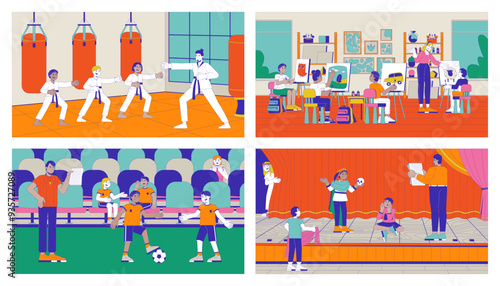 Vector illustration of saleswoman selling vegetables to buyers man, woman, family at greengrocery. People making purchases concept, flat style design.