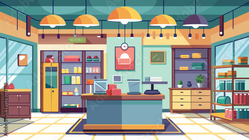 Vector illustration of grocery store or supermarket shelves, cashier, promoters advertizing products, buyers with shopping carts and baskets. People making purchases concept, flat style design.
