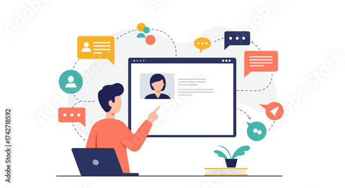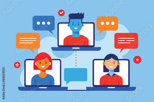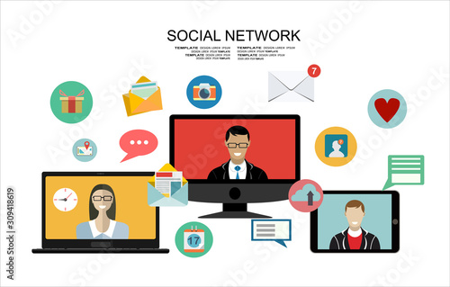 Man and woman meeting, chatting on dating site, app using mobile phone, laptop computer, vector flat illustration. Online chat messaging, dating service, virtual love and people relationship.
