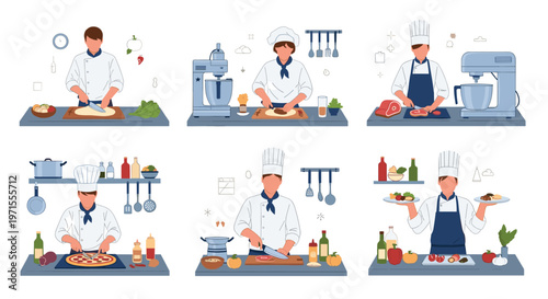 People of different occupations and professions at workplace, flat vector illustration. Doctor pediatrician, veterinarian, scientist, news anchorman, massage therapist, radio host, office worker.