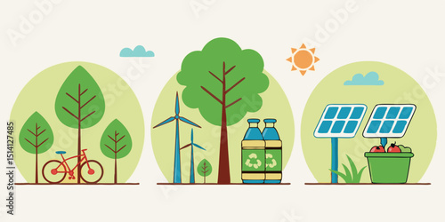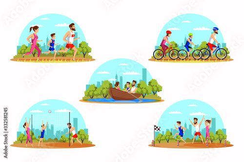 Bbq set, vector flat illustration. Picnic with family, friends and pets in park, in backyard. Elderly and young couples, family with two kids cooking meat on barbeque grill, eating and having fun.