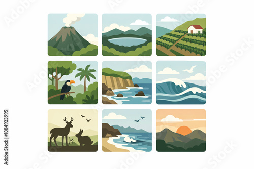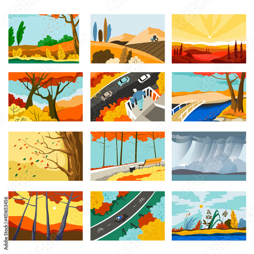 People on kayak rowing down to river. Water adventure sport vector posters set. Man and woman rafting, kayaking, canoeing, holding paddles. Camp with tent on lake beach.