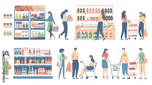 People pet lovers visiting cat cafe, flat vector illustration set. Male and female characters, cafe staff customers playing with adorable cats, petting cute kittens, eating sushi, fast food, desserts.