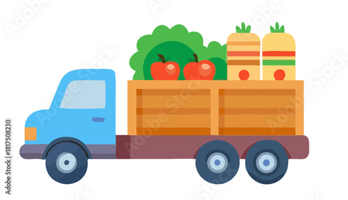 People picking apples in orchard and loading fruit crates into truck for transportation, flat vector illustration. Fruit harvesting, gardening, agriculture.