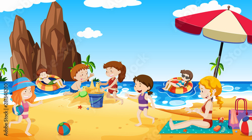 People relaxing on ocean beach, playing ball, riding water scooter, sunbathing under umbrella, flat vector illustration. Tropical vacation. Travel. Summer beach activities.