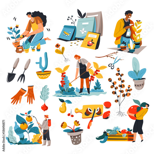 People prefer healthy eco products vector set. Cartoon man and woman holding natural fruits and vegetables illustration. Vegetarianism, environment preservation, ecology protection concept