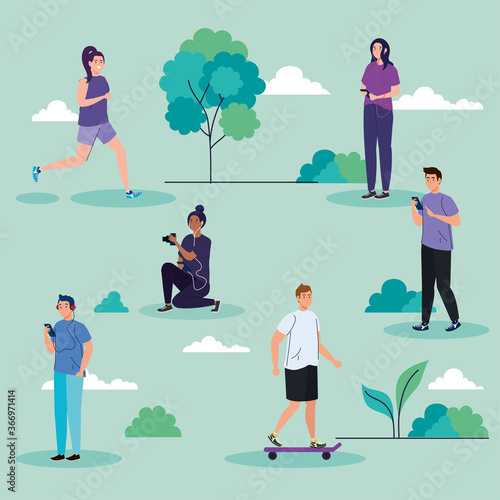 Happy people riding bicycle, electric scooter, skateboarding, training outdoors, couple and mom with baby pram walking in city park, flat vector isolated illustration. Outdoor leisure activity.
