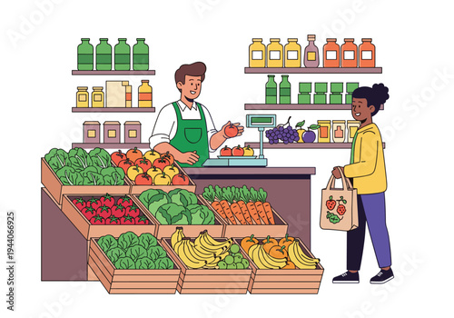 People shopping in grocery store or supermarket concept vector illustration. Organic shop with fruits and vegetables. Woman with trolley buying food. Shelves with food products and bakery.