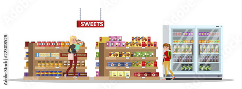 People shopping in grocery store or supermarket concept vector illustration set. Shop with organic fruits and vegetables. Man with basket buying food. Store cashier, shelves with food products.
