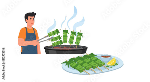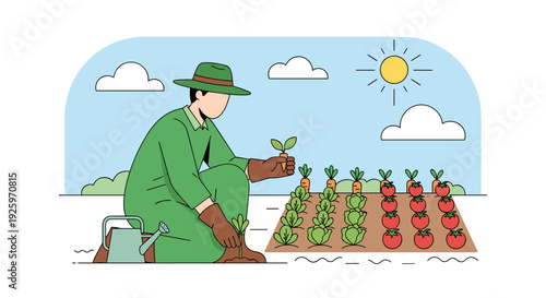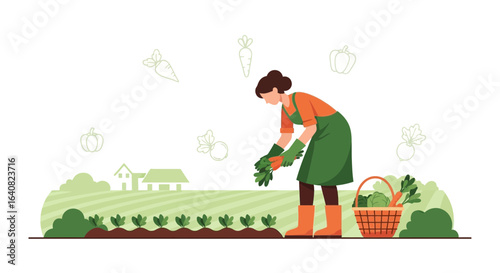 Vector illustration of market stall with vegetables and saleswoman with paper money. People shopping flat style design element, icon isolated on white background.