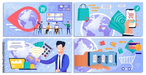 People sit in airplane while flying vector illustration set. Air plane cabin interior. Flight attendant explains air safety rules. Landscape view from aircraft window.