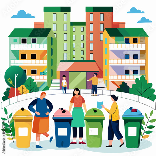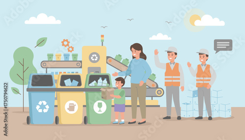 People sort trash for recycle concept vector posters set. Man and woman separate grabage in different waste bin. Plastic bottle, organic waste, paper, glass.