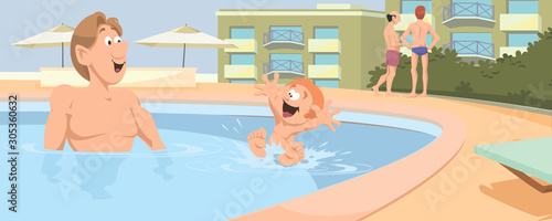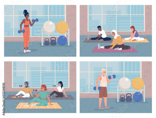 People swim in public swimming pool concept vector illustration set. Sport swimming pool interior. Man and woman swim in water. Girl taking shower after swimming.