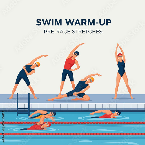People swim in public swimming pool concept vector illustration set. Sport swimming pool interior. Man and woman swim in water.
