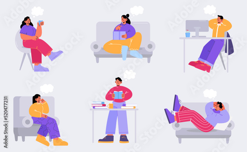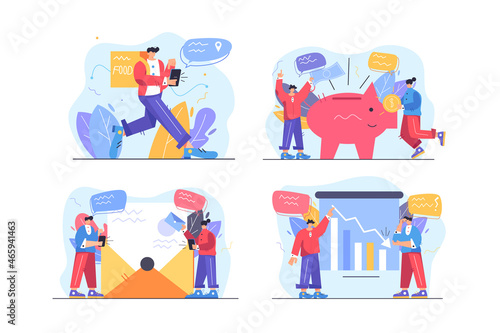 People drinking coffee or tea while sitting at tables and talking to each other, walking in the street. Vector flat style design illustration isolated on white background. Coffee break concept.
