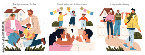 People travel by subway train vector illustration set. Passengers on crowded platform boarding metro train. City underground public transport. People watching mobile phone and reading while commute.