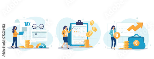 Businesswoman use AI smart analysis technology vector. Woman working with big data in graph and chart. Database analyzing, metaverse and virtual reality business workplace visualization
