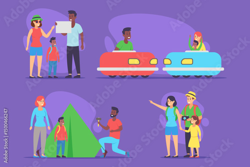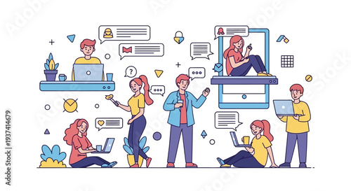 Male and female cartoon characters working, surfing the net using laptop computers at home, in office, cafe and in the park, vector flat illustration isolated on white background.