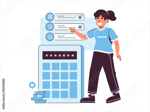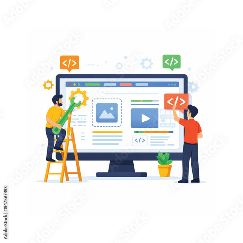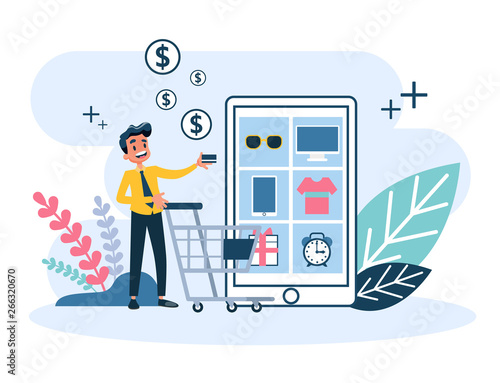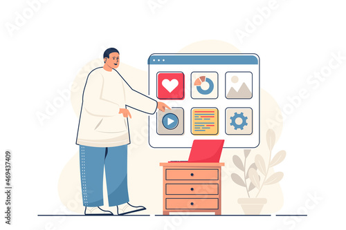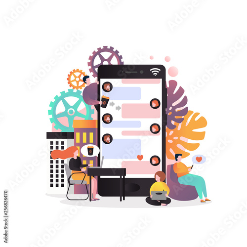 Micro male and female characters using huge smartphone with mobile app icons on screen, vector illustration. People using gadgets of modern technology concept for web banner, website page etc.