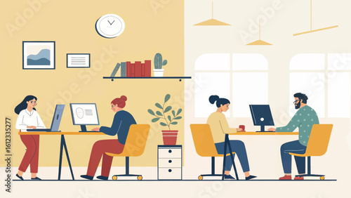 People wait in line on reception in veterinary clinic concept vector illustration. Vet hospital interior. Black veterinarian doctor examing cat on a table. Man and woman with animals.